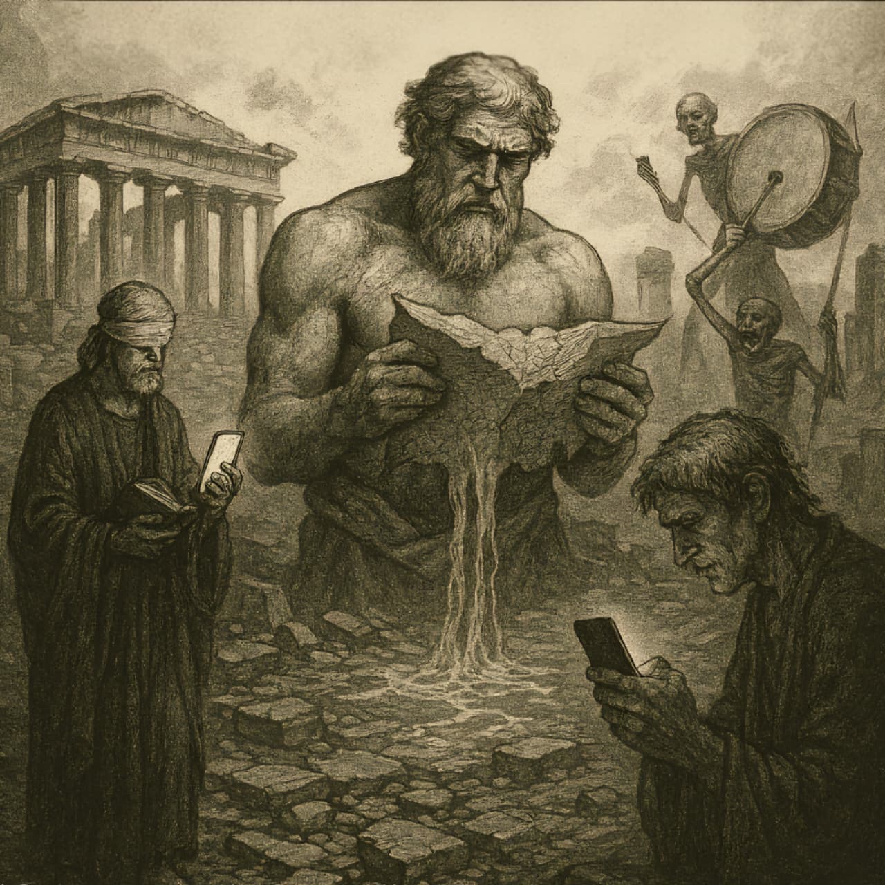 Смартфоны стали мостами для вторжения в разум. Доверие к случайным авторитетам заменило мышление. Мы не падаем – мы истекаем, пока гробовщики у руля спорят, в каких саванах нам легче упокоиться. Их руки держат выцветшие книги, где буквы рассыпаются в прах.