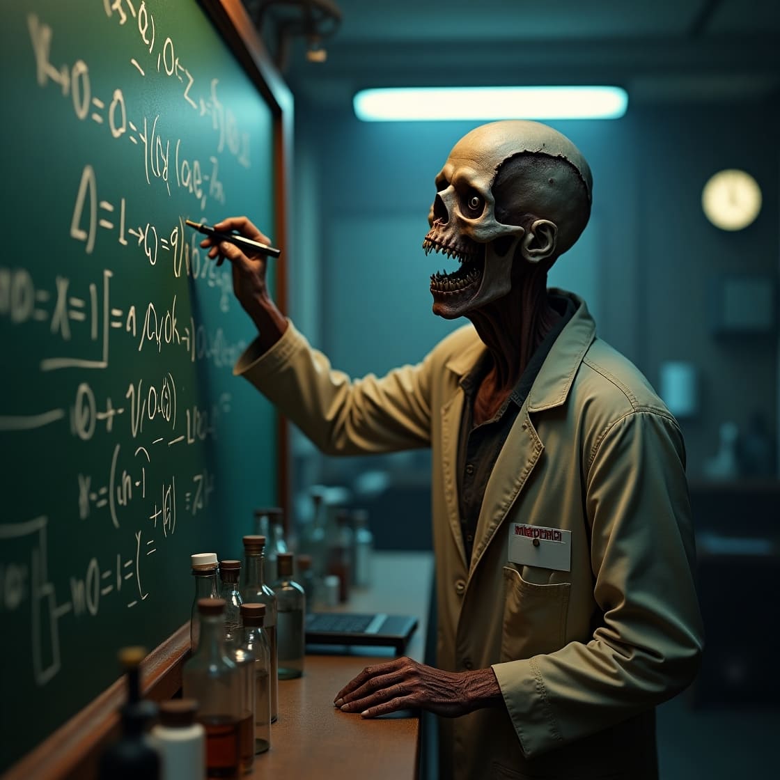 Пифагор – так я назвал своего математика, стоит за стеклянной доской, и его пальцы, лишённые плоти на кончиках, бесконечно водят по стеклу, выводя те же формулы. Стук костяных фаланг о стекло --- это тиканье часов, отсчитывающих время до нового откровения. Иногда он замирает, и в его глазах вспыхивает прежний, дикий голод, он бросается на стекло, но через несколько секунд отступает, снова погружаясь в свои вычисления, словно сильная воля подавляет древний инстинкт. Борьба продолжается. Внутри него.