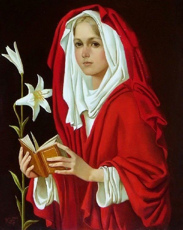 * Христианская Символика: Белая Лилия является одним из наиболее узнаваемых символов Девы Марии, олицетворяя ее чистоту, непорочность и благодать. Она часто изображается на картинах Благовещения, где Архангел Гавриил вручает Деве Марии Лилию. В контексте Пасхи Лилия символизирует Воскресение Христа и надежду на вечную жизнь.