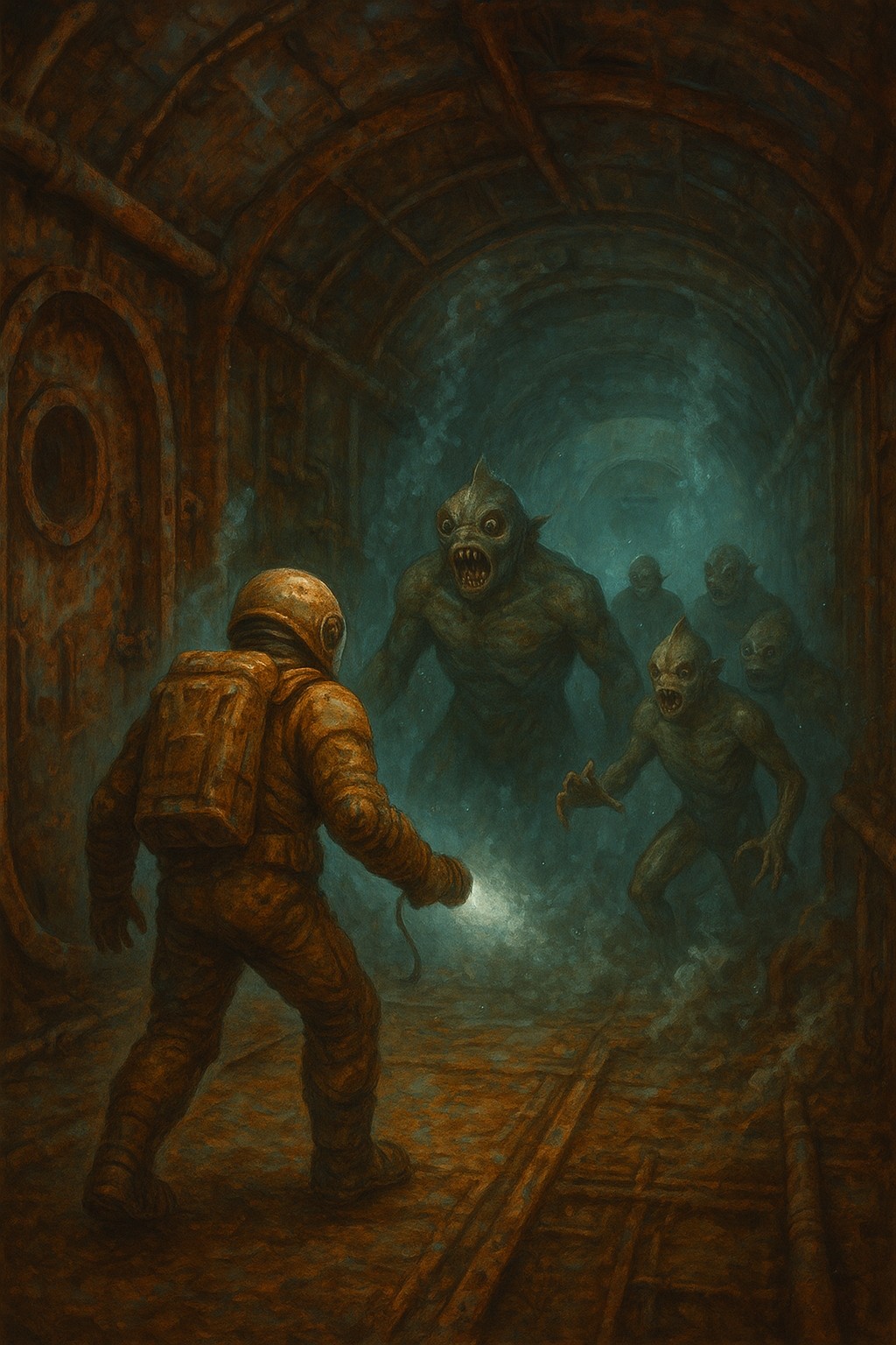 Теперь пришла моя очередь влезть в скафандр, и это оказалось непросто: никто не помогал, каждая деталь требовала точности, каждое движение — усилия. Тем не менее, мне удалось обеспечить полную герметичность костюма и включить систему жизнеобеспечения. Внутри сразу почувствовалось движение воздуха — мягкое шуршание вентиляторов, легкое давление на грудь и голову, как будто костюм жил своей собственной жизнью. Индикаторы показывали низкую зарядку аккумуляторов, но сейчас это было второстепенно. Главное — всплыть, а там как-нибудь продержимся.