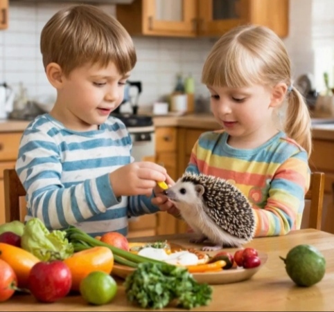 Ребята вместе со взрослыми подготовили уютное местечко для ежа: подстилку из мягкой ткани, мисочку с водой и тарелочку с кусочками яблок и овощей. Ёжик, почувствовав заботу, вскоре расслабился и начал исследовать новое пространство.