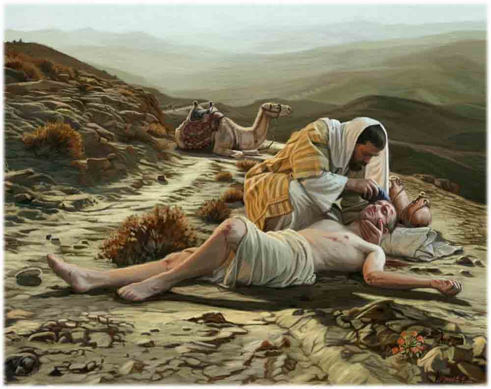 Направлявшемуся из Иерусалима в Иерихон путнику предстояло идти через Иудейскую пустыню. Дорога пролегала по дикому каменистому ущелью, где было полно разбойников, здесь часто совершалось насилие. Тут-то и напали на этого человека: у него отобрали все ценное и, израненного, избитого, бросили его у дороги полуживым. Он лежал беспомощный, а мимо проходил священник. Но лишь мельком он взглянул в сторону раненого. Затем появился левит. Заинтересовавшись случившимся, он остановился, разглядывая страдальца. Тот нуждался в помощи — это было очевидно, но левиту казалось неприятным возиться с истекавшим кровью человеком, он даже пожалел, что пошел этим путем и увидел раненого. Он постарался убедить себя, что это дело его не касается.