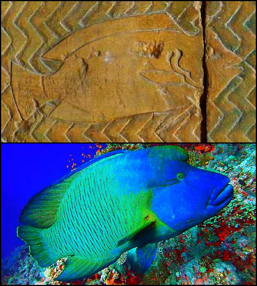 На снимке - совмещение "портрета" рыбы-наполеона (Cheilinus undulatus) на рельефе из храма в Дейр-эль-Бахри (14-я фигура в нижнем регистре южной стены) и её фотографии в море.
