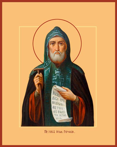 Преподобный Иов, игумен Почаевский, чудотворец (в миру Иван Железо), родился в середине ХVI века в Покутье в Галиции. В возрасте 10 лет он пришел в Преображенский Угорницкий монастырь, а на 12-м году жизни принял монашество. С юности преподобный Иов был известен величайшим благочестием, строгой подвижнической жизнью и рано был удостоен священнического сана. Около 1580 года, по просьбе известного поборника православия князя Константина Острожского, он возглавил Крестовоздвиженский монастырь близ города Дубно и управлял монастырем более 20 лет в обстановке нараставших гонений на православие со стороны католиков и униатов. В начале ХVII века преподобный удалился на Почаевскую гору и поселился в пещере неподалеку от древней Успенской обители, славной своей чудотворной Почаевской иконой Божией Матери. Братия обители, полюбив святого отшельника, избрали его своим игуменом. Преподобный Иов, ревностно исполняя должность настоятеля, был кроток и ласков с братьями, сам много работал, сажал в саду деревья, укреплял плотины близ монастыря. Принимая деятельное участие в защите православия и русской народности, преподобный Иов присутствовал на Киевском Соборе 1628 года, созванном против унии. После 1642 года преподобный Иов принял великую схиму с именем Иоанн. Иногда он полностью затворялся в пещере на три дня или на целую неделю. Иисусова молитва была непрестанным деланием его кроткого сердца. По свидетельству ученика и составителя жития преподобного Иова Досифея, однажды во время молитвы преподобного пещеру осиял небесный свет. Скончался преподобный Иов в 1651 году, прожив более 100 лет, после пятидесятилетнего управления Почаевской обителью. 28 августа 1659 года совершилось прославление преподобного Иова.