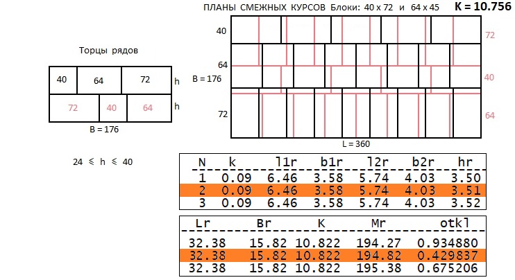 32.38 х 15.82 х 17.55 м. Основной критерий кладки К = 10.822. Габариты двух типов блоков:
