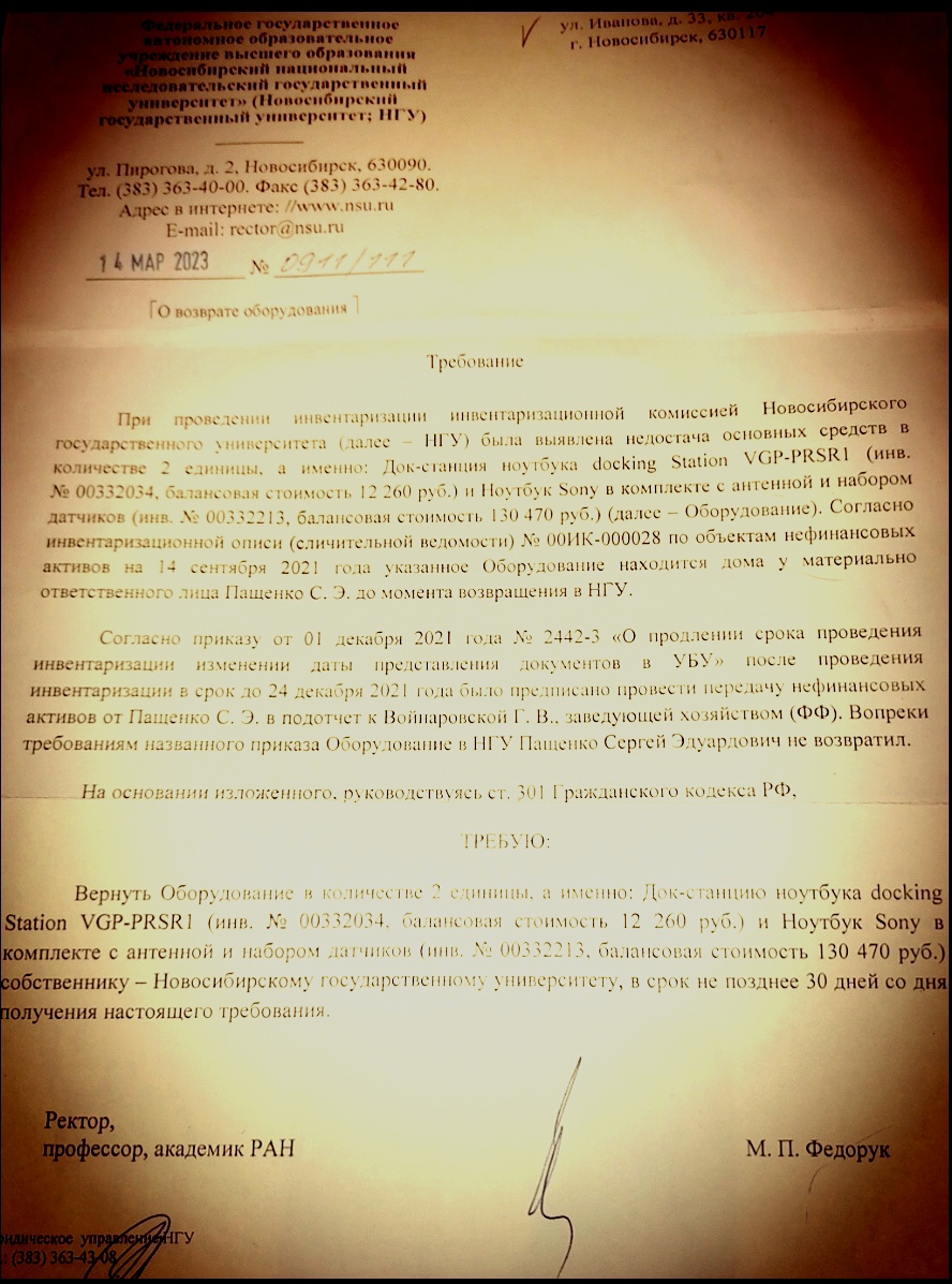 На изображении представлен официальный документ — требование о возврате оборудования. Это письмо от Новосибирского государственного университета (НГУ) к Пашенко С.Э. Документ датирован 14 марта 2023 года и имеет номер 0911/117.