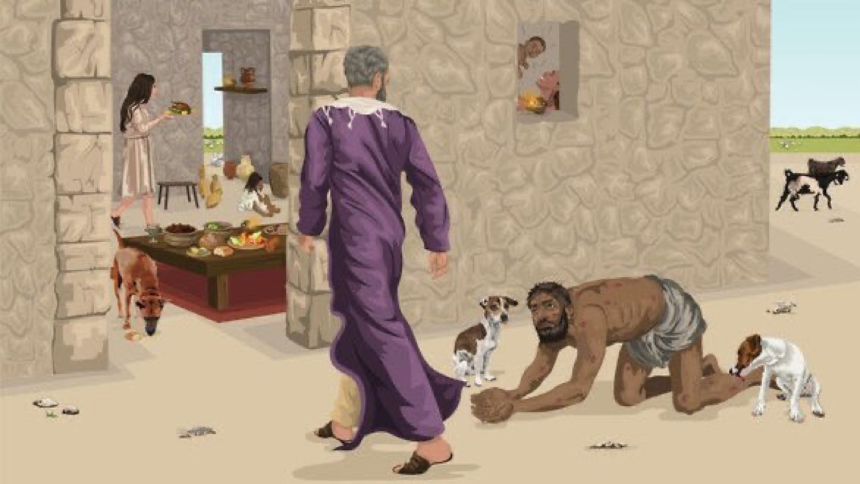 У ворот его лежит Лазарь, покрытый струпьями, жаждущий полакомиться крошками, падающими со стола богача.