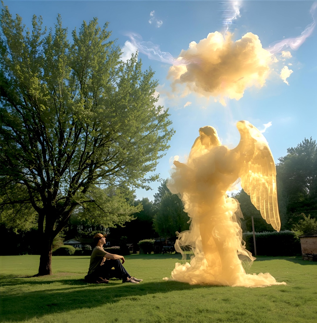 Облака эти золотистые переливались внутри себя, клубясь золотистой пылью на фоне голубого неба. Гораздо большего размера были эти облака золотой пыли, чем образ Ангела-Хранителя. Подлетели они к человеку и остановились. Смотрел человек на них снизу-вверх на большие живые золотистые облака. Спрашивает он Ангела-Хранителя: