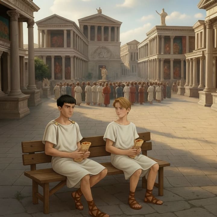 Ноги, привыкшие к мягким протекторам кроссовок, ныли от каждой трещины в каменной мостовой, которую они ощущали через тонкие подошвы сандалий. Никита едва поспевал за быстрым, уверенным шагом Титуса. Споткнувшись о глубокую выбоину, он чуть не угодил под колеса проезжавшей мимо груженой повозки.