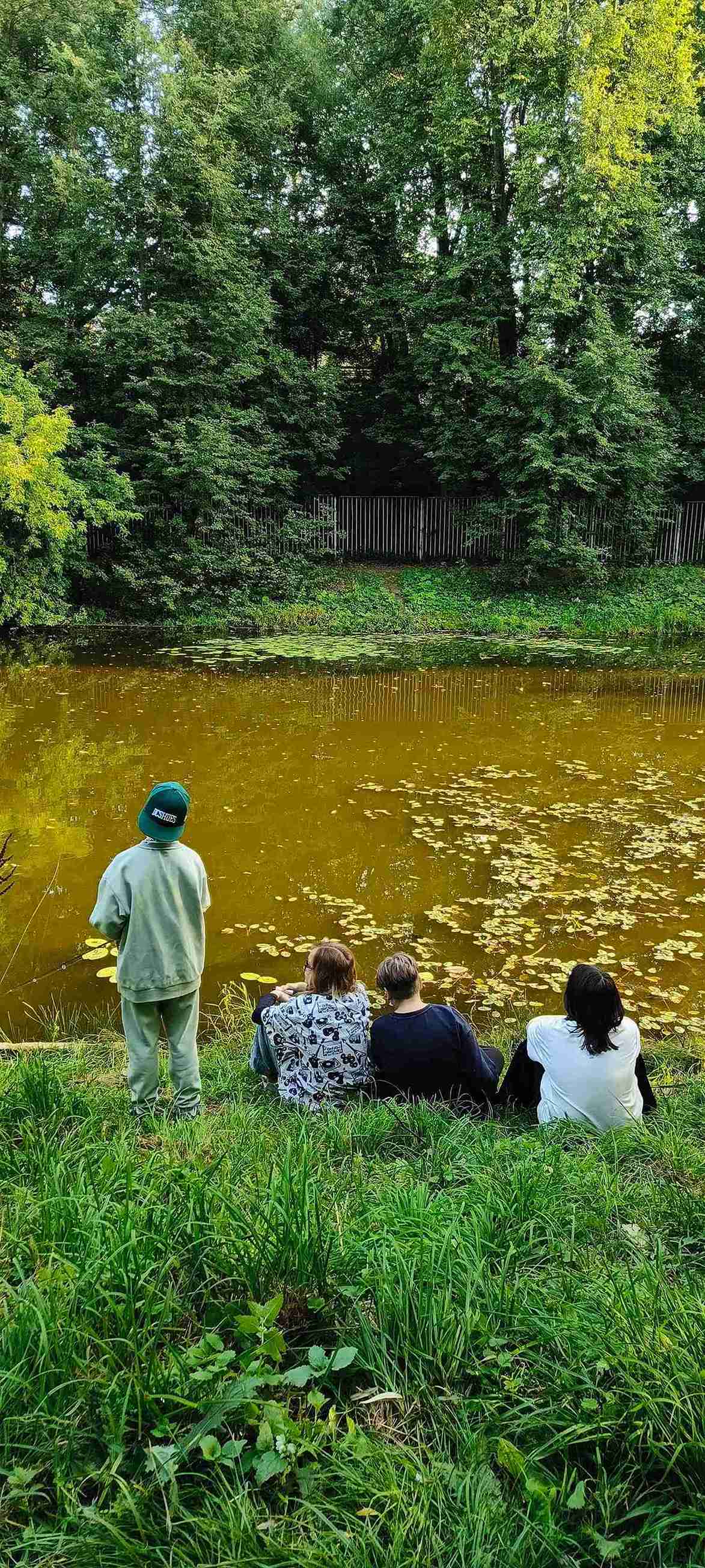 Интересны образы: задумчивый мужчина на лавочке... детвора с удочками... мама, папа и коляска...