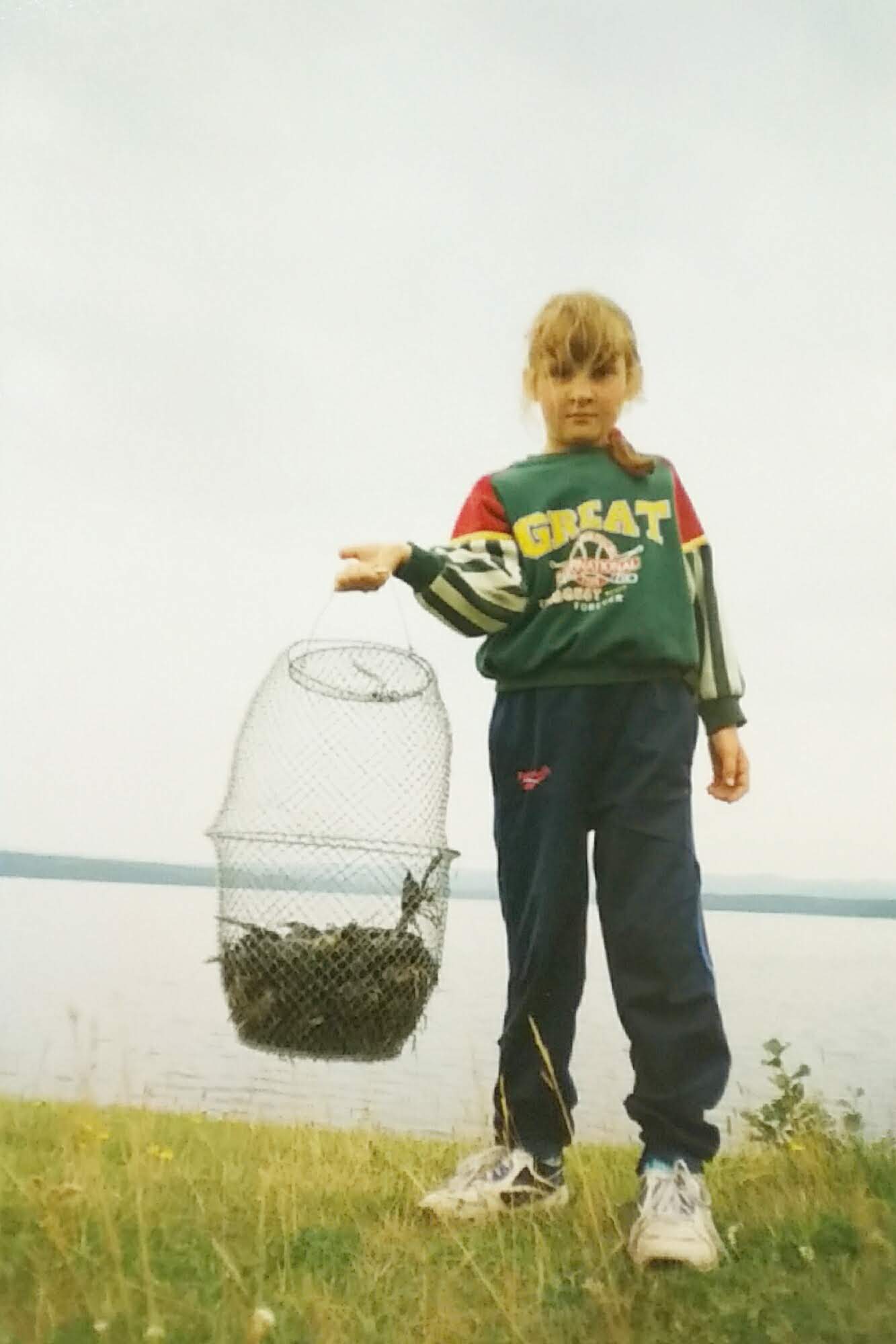 На фото: дочь Виктория с выловленными раками. Озеро Теренкуль, Челябинская область, август 1997 года.