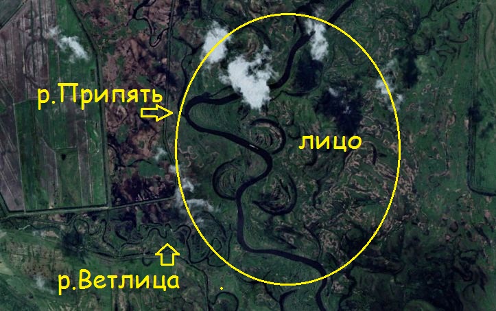 Река Ветлица находится в Беларуси, впадает в реку Припять, которая в этом месте "рисует лицо", как видно на фото. Ветлица впадает в "рот лица".