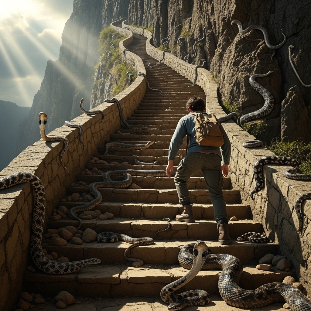 Я прохожу испытание в эзотерической школе. Мне нужно подняться по ряду каменных лестниц на высоту 480 метров – то ли над уровнем моря, то ли вообще, но это хоть как много. Меня предупредили, что будут в большом количестве змеи. На первой площадке и пролете это престо перепутанные провода-кабели (известная иллюзия, описанная в сакральных индийских текстах). Здесь важно не споткнуться. Далее на ступенях появляются тонкие змейки, похожие на длинных земляных червяков. Это не так страшно, как-то обхожу их, они чуть шевелятся, к тому же у меня толстые спортивные ботинки. . Поворачиваю от пролета к пролету, змей становится меньше. Идти не очень легко, но дыхания хватает.