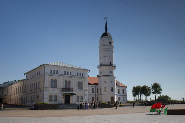 Перед нами открылась панорама главной площади города. На высоком холме над Днепром находится исторический центр Могилёва. Городская ратуша (1682 г.) является архитектурным украшением. В центре площади — мемориальный комплекс «Борцам за Советскую власть» бронзовой женской фигурой на высоком постаменте и вечным огнём у подножия. Мемориал посвящен красноармейцам, погибшим при обороне города в 1920 г. во время наступления белополяков.