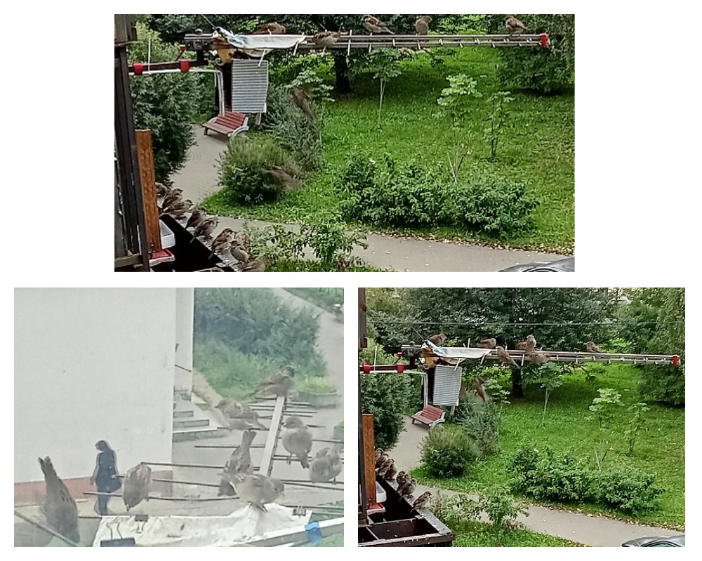 Количество прилетевших на ежедневное кормление пташек доходит до 30.Они рассаживаются вдоль ограждения балкона под кормушкой и рядами усаживаются на лучи антенны и нет драки всем хватит…не сегодня так завтра и еще десяток их сидят на ветках дерева рядом растущего …вот как я мог всю жизнь прожить и не подкармливать бедолаг ведь и им прохода нет и кошки и голуби гоняют и воды порой нет …я наливаю с графина им воду в тару и периодически скидываю воду(голуби факт любители гадить в еду…вот представьте себе коня пришедшего на водопой ,который тут же где пьет стоит и срет), когда под окнами нет проходящих людей и наливаю новую. как пьют не видел и даже снимки их пиршества сняты через стекло балкона и потом в соседнем окне своей другой комнаты.