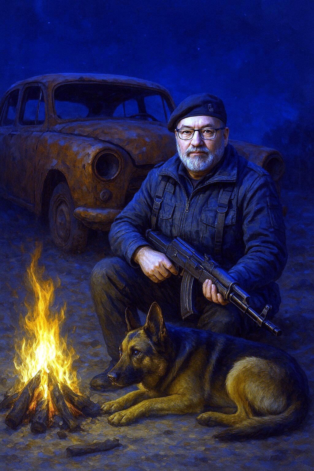 Я дёрнул Барсика за ошейник и, не отрывая взгляда от черноты между кузовами, медленно поднялся. АК-47 лёг на плечо, палец скользнул к спуску. Сердце билось глухо, как барабан. Ветер вдруг стих, и всё вокруг стало подозрительно тихо — только пламя костра шипело, словно знало, что его сейчас бросят.