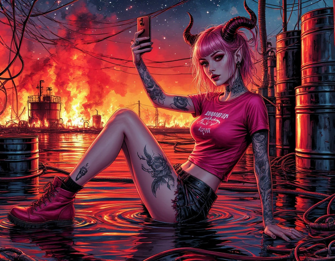 — Добавим огоньку? — улыбается и щёлкает пальцами. В ужасе вижу, как среди женских волос прорываются отвратительные козлиные рога. Салон охватывает пламя, я пытаюсь вырваться из этого кошмара, бью по стеклу, задыхаясь. В её глазах я вижу свою смерть. Она облизывается и приподнимает юбочку: