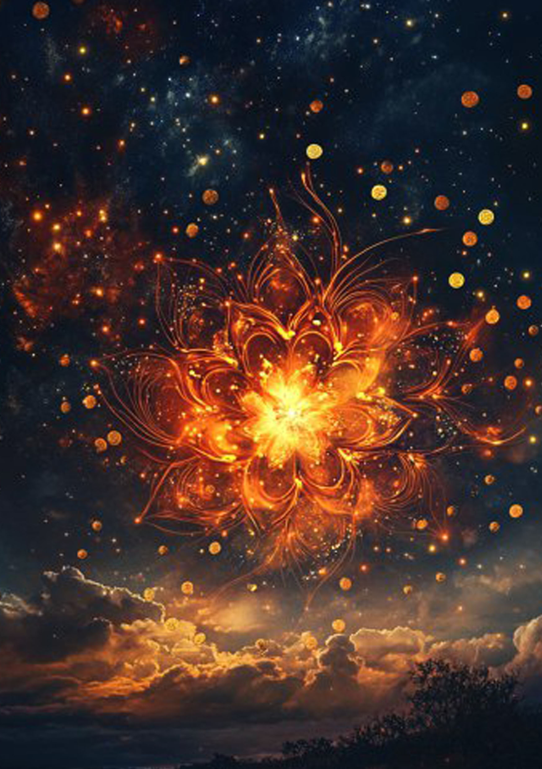 Его лепестки, мерцая, превратились в сверкающие капли золота. Они замерли на мгновение в ночном небе, словно сама вселенная задержала дыхание, чтобы полюбоваться этим чудом.