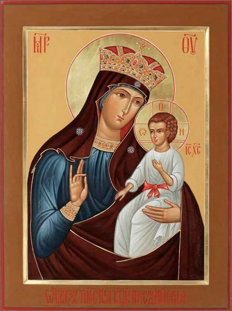 «О, Пречистая и Преблагословенная Дево, Владычице Богородице, от неплодове по обетованию рождшаяся и чистоты ради души и тела Твоего сподобльшаяся быти Материю Сына Божия, Господа нашего Иисуса Христа, с Нимже ныне на небеси пребывавши и имаши велие дерзновение ко Пресвятой Троице, от Неяже, яко Царица, венцем вечнаго царствования увенчана еси. Темже смиренно к Тебе прибегаем и просим: исходатайствуй нам у Всемилостиваго Господа Бога прощение всех прегрешений наших вольных и невольных; страждущему отечеству нашему спасения, мира, тишины и благочестия возстановление, времена мирны и безмятежны, крамол злых непричастны; ко изобилию же плодов земных, воздуха благорастворения, дожди мирны и благовременны. И вся, яже к житию и спасению нашему потребная, испроси нам у Сына Твоего, Христа Бога нашего. Наипаче же благопоспеши нам украситися благими нравы и добрыми делы, да, елико мощно, подражатели будем святому Твоему житию, имже от юности на земли украшалася еси, благоугождающи Господу; сего ради явилася еси честнейшая Херувим и славнейшая Серафим. Ей, Госпоже Пресвятая, буди нам во всем скорая Помощница и премудрая ко спасению Наставница, да Тебе последствующи и Тобою воспомоществуеми, сподобимся наследницы быти Небеснаго Царствия, страданиями Сына Твоего исходатайственнаго, исполнителям же святых заповедей Его обещаннаго. Ты бо еси, Госпоже, едина наша по Бозе надежда и упование, и Тебе весь живот наш предаем, чающе Твоего ради ходатайства и заступления не посрамлены быти в час исхода нашего от жития сего, и на Страшном Суде Сына Твоего, Христа Бога нашего деснаго Его стояния сподобитися, и тамо вечно радоватися со всеми от века Ему благоугодившими и немолчно славити, хвалити, благодарити и благословляти Его со Отцем и Духом во веки веков. Аминь.» Икона Богородицы Писидийская