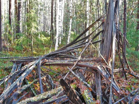 Многометровые щепы раскидало взрывной волной в стороны от ствола, а куски - ошмётья коры, развесило на ближайших соснах, елях, берёзах на высоте семи- восьми метров. – Столь могуч удар природной стихии! - Ствол столетней лиственницы, толщиной в тридцать-сорок сантиметров и длинной в пятнадцать метров разнесло полностью до комля, будто спичку! Разорвало в мгновение на сотни ровных игл. Словно отточенным лезвием, древесину остругало с краёв, превратив в идеальные реечки длинною до пяти- шести метров и толщиною от сантиметра до пяти- семи. Они, словно срезаны острым ножом,- сверху вниз и донизу – до самой земли, сохранив при том ветки, но лишившись коры.