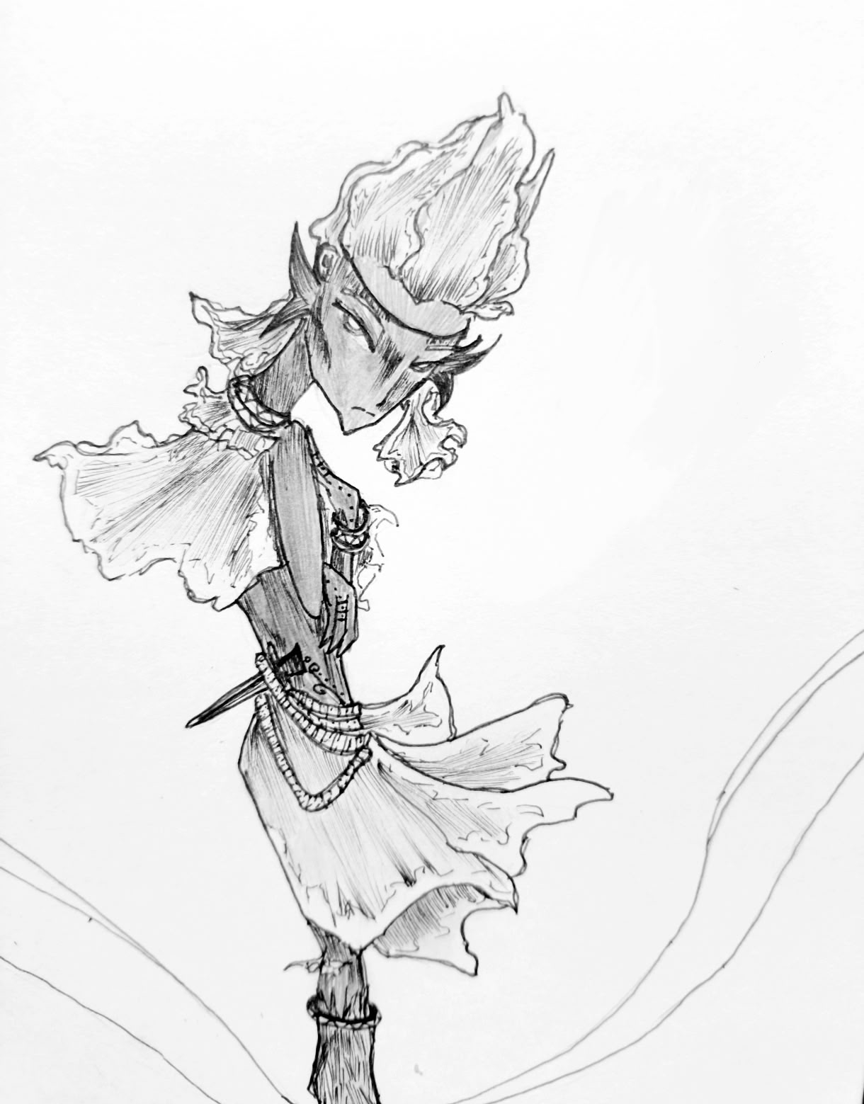 Жара постепенно уступала место освежающей прохладе. Всё чаще раздавались далёкие тревожные трели птиц. Они разносились порывистым ветром по крутым склонам, местами припушённым сухими травами. Вниз по одному из склонов время от времени с предательским стуком катились камешки. Цветик граната каждый раз, когда её осторожный шаг вниз вызывал хоть какой-то звук, крепко жмурилась и иссохшими губами молча читала молитвы. Лепестки у неё словно смятая оранжевая ткань с белой окантовкой, большая часть из которых была плотно подвязана, чтобы не мешаться. На поясе несколько раз обмотанная простая, но крепкая верёвка – в теории она была бы полезна для облегчения спуска, но так сложилось, что цветику просто не находилось места, чтобы её закрепить. Её родное дерево осталось далеко наверху, его раскидистую древнюю крону она давно уже потеряла из виду. Нельзя было оступаться, чтобы ни привлечь хищников лишним шумом, однако камушки весело отпрыгивали вниз в вперемешку с пылью почти каждый раз, когда цветик немного проскальзывала босой ступнёй по склону. Пальцами-ростками из древесных волокон было проще цепляться за крошечные выбоины в породе, поэтому обувь свою она повязала на поясе ещё в самом начале пути.