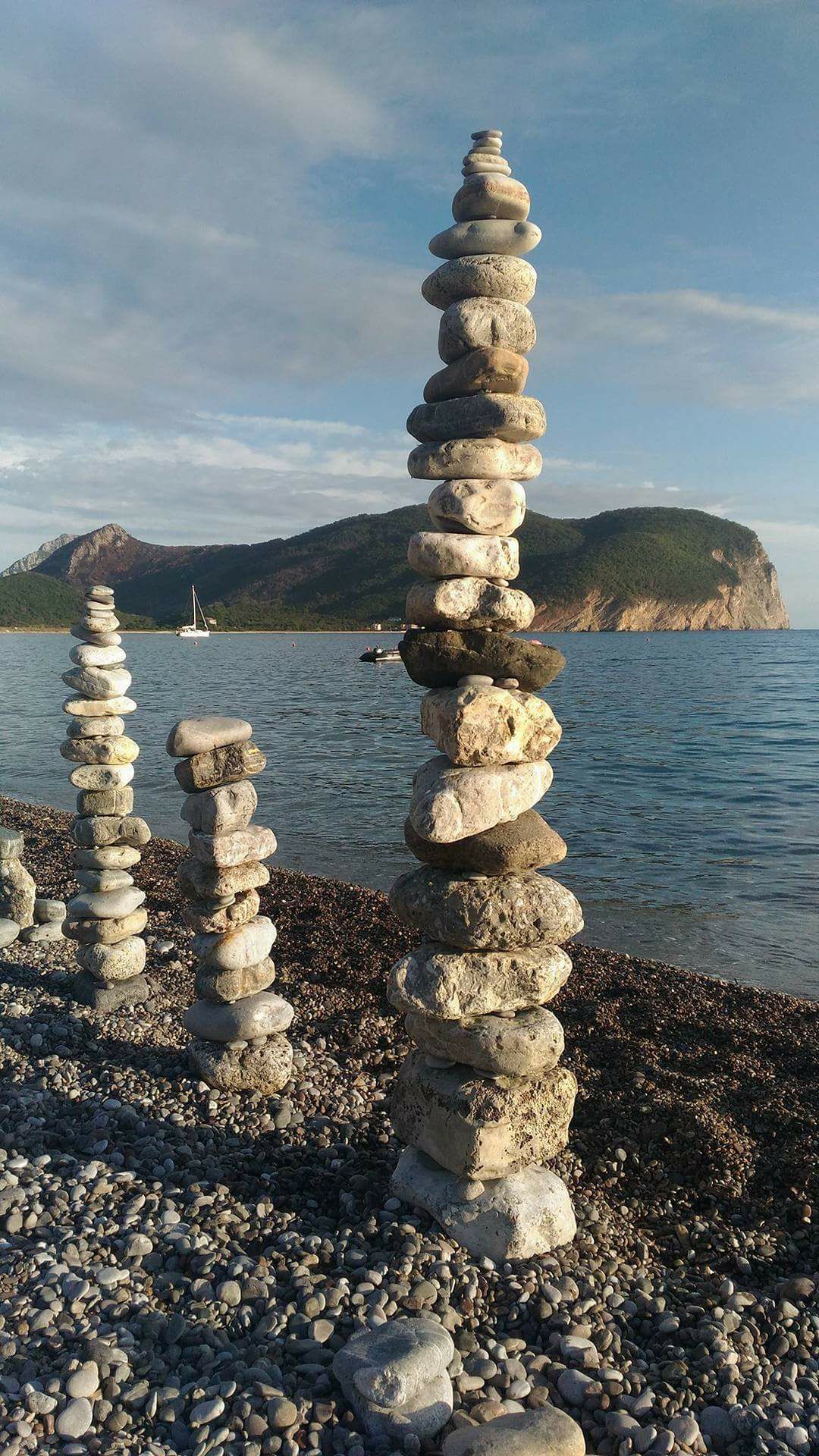 Неподалеку осталась лишь пара сравнительно молодых людей, - он и она, высоких, крепкого спортивного телосложения, неподвижно стоящих на берегу и смотрящих на море. Это походило на какой-то неведомый мне молчаливый ритуал. И тут они синхронно повернулись и стали собирать крупную гальку. Мужчина неторопливо клал камни один на другой, следя за устойчивостью конструкции, руки его сами находили нужную точку, на которую следует поставить очередной камень, женщина подносила новые. По отрывочным фразам я понял, что они из Германии. Когда солнце коснулось воды, берег уже украшали три тонкие высокие башни. Мужчина и женщина еще постояли, молча глядя на море, повернулись и ушли.