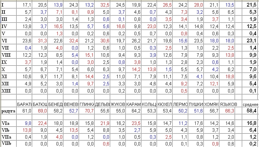 Процентные доли всех цветовых групп для каждого поэта и их средние показатели (нейтральный фон данного периода) указаны в таблице на фото в начале текста.