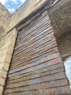 — Факт: на выходе — ворота с деревянной створкой, усиленной железными полосами и заклёпками («кольчуга»).