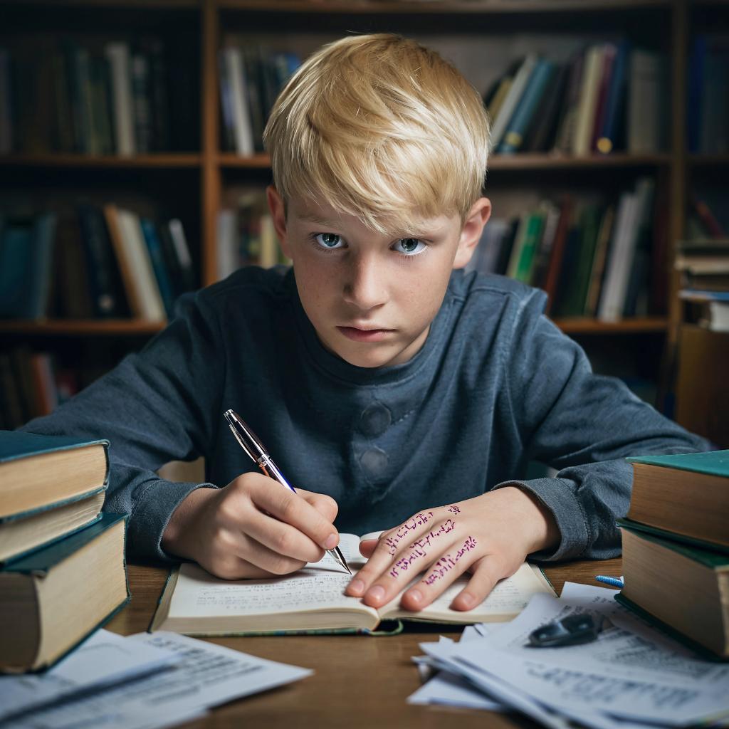 Увидев в дверях маму, Кузька прикрыл предплечье рукавом своей бежевой толстовки. По причине эмоционального волнения, мама не заметила стараний брата по подготовке к контрольной.