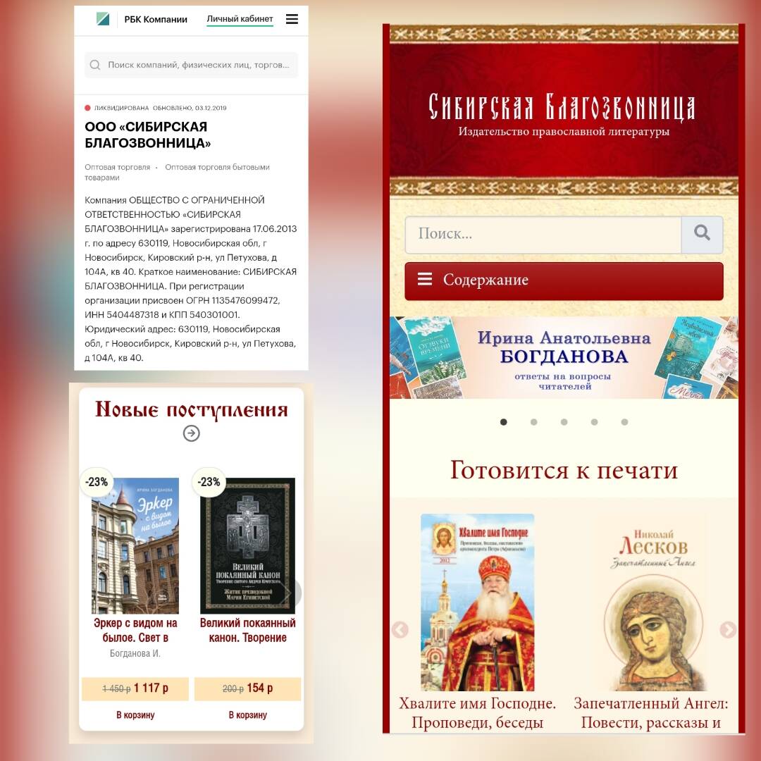 Издательство православной литературы "Сибирская Благозвонница" было ликвидировано ещё в 2019 году, в то время как на сайте этого издательства представлена по факту ложная информация о том, что они продолжают работать, даже анонсируются новые книги, предлагаются скидки на оптовые заказы.