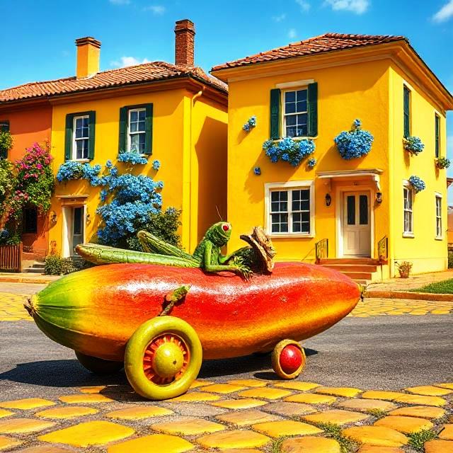Машина была похожа на большой полый огурец. Колёсами у неё служили четыре редиски. А за рулём сидел кузнечик в старомодной фуражке и смотрел на Лену настороженным взглядом. Машина затормозила около девочки, кузнечик высунулся из окна и крикнул: "Не стой на дороге! Не мешай движению!", и машина понеслась дальше.