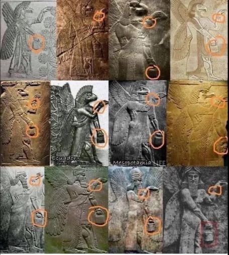 В шумерском случае это вообще не сумки. Это ведра, вероятно, используемые для полива священного дерева. Они на самом деле идентифицированы как ведра в шумерских текстах, и даже есть сохранившиеся примеры таких ведер, которые выглядят точно так же, как на изображениях.