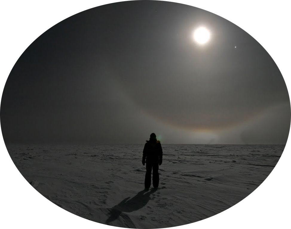Ослепительный диск ночного светила заливал этот, выстуженный до космического состояния мир, в котором царили абсолютные безмолвие и сияющая всеми оттенками синева ледяных застругов снега, вылизанного пургами до зеркального блеска. Справа от беглеца грозно темнели склоны , лощины и сам - с ломаными линиями - хребет протяжённой горной системы; слева же пряталась в сугробы возвышенность более мягких очертаний; а прямо - на все сотни нетронутых следами живого километры просторов - лежала плоскость, ведомая ему только тем что простиралась она ко льдам великого океана.