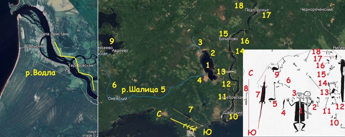 14. "рыба с перпендикуляром и контурным кружочком на конце", обозначение острова на Водле, после "лосиной головы", перпендикулярная черта с кружком, вероятно привязка местности "на восток", так как похожий перпендикуляр с кружком на Пери Нос, указывает поворот Шалицы на восток. Подтверждает ориентацию по сторонам света. "Человек с копьём", обозначает излучину Водлы в виде "лица" человека в профиль, напротив острова! Копьё, это прямое, тонкое русло ручья Забочажье. Такой же символизм есть и на Пери Нос. Лицевые гидронимы довольно многочисленны у славян, например река Ветлица http://proza.ru/2025/09/14/1791