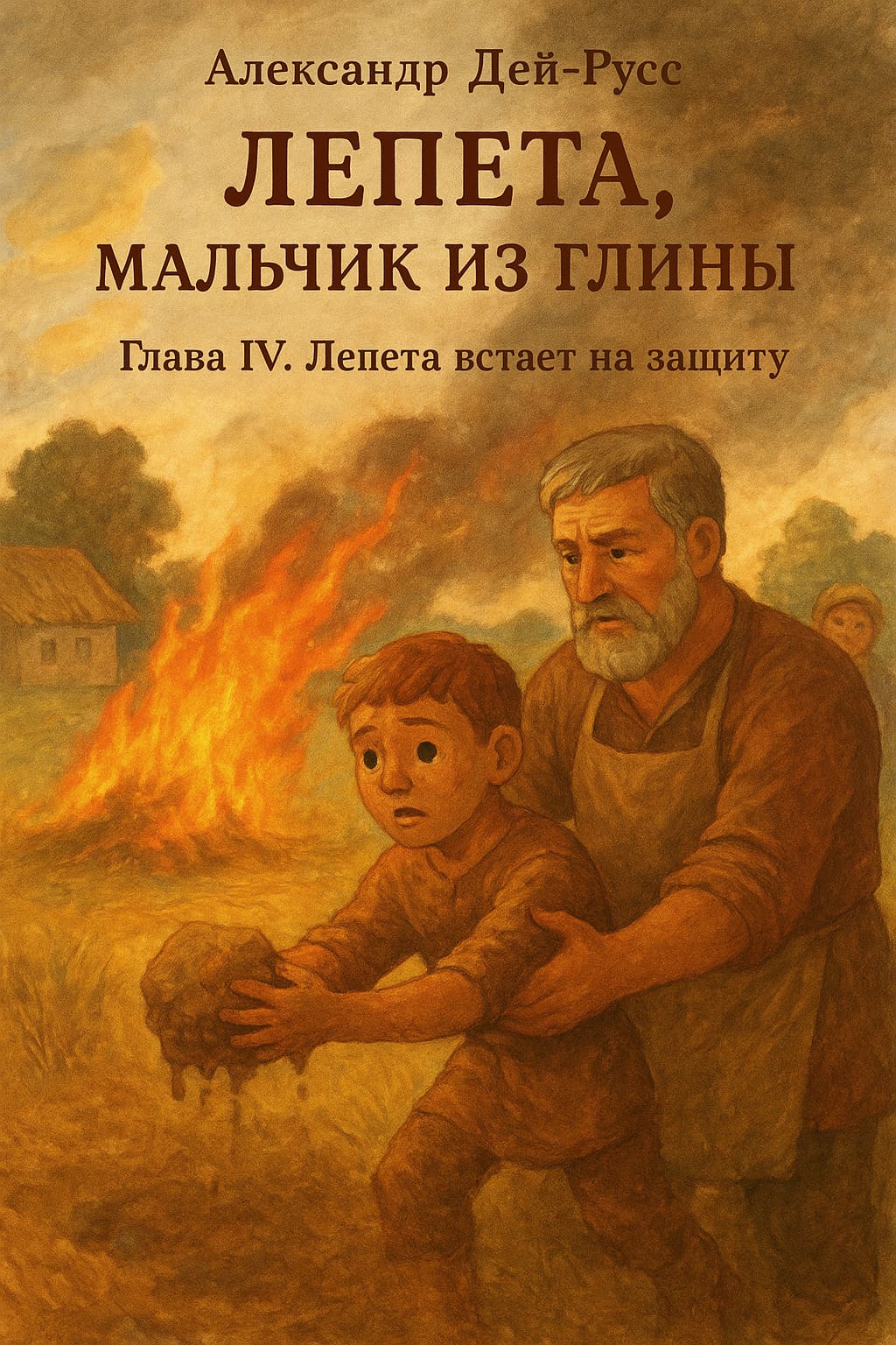 И не дожидаясь ответа, побежал прямо к пылающему стогу. Там, где жар был сильнее всего, земля треснула — и показалась яма с глиной, растрескавшейся от зноя. Лепета, не думая, кинулся туда, стал руками кидать влажные куски и закидывать ими огонь. Глина сразу прилипала, душила пламя, не давала ему разрастись.