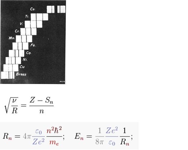 Также видно, что эти спектры смещаются от металла к металлу не как попало, а закономерно. Но как закономерно? Мозли попытался чисто эмпирическим путем найти такое сочетание величин, чтобы подставляя его в формулу, можно было однозначно определить смещение. Так, кстати, выводится большинство физических формул: не из постулатов и теорем, а подборов цифр и величин, которые могли бы соответствовать значениям, полученным в эксперименте.