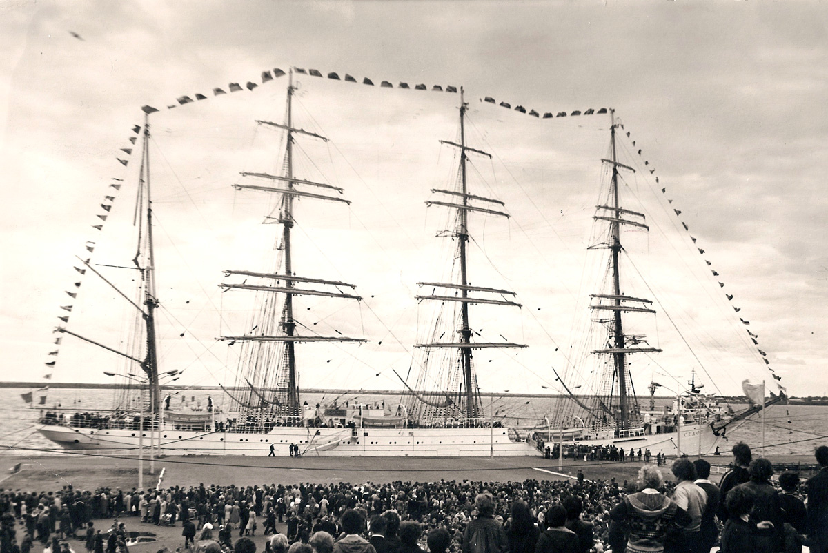 Гвоздём программы несомненно были сами суда: маленькие и большие, деревянные и стальные, древние и современные. Подзнаменованы все общим ветряным движителем — парусом. Каждое судно, гордое своей историей, принимало посетителей. Советские, самые большие в мире парусники, не были исключением. Объявили день открытых дверей. Выстроились длинные, на сотни метров в длину очереди из желающих подняться на борт какого-нибудь парусника. Без преувеличения (но и без скромности) скажу, что самая длинная очередь была именно на “Седов”.