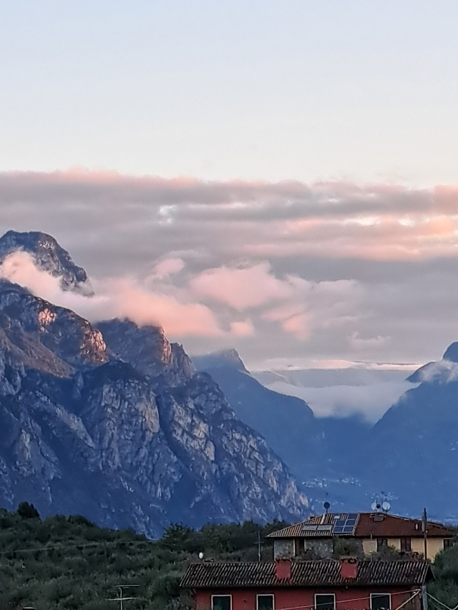 На фото - вид с балкона из номера в отеле, где я жила. Вечер. Альпы.