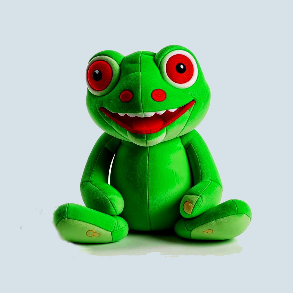 Лягушка была, мягко говоря, своеобразная: размером с подушку, лёгкая, мягкая, ярко-зелёная, с тонкими болтающимися конечностями, открытым в улыбке красным ртом до ушей, белым брюшком и красными вытаращенными глазами.