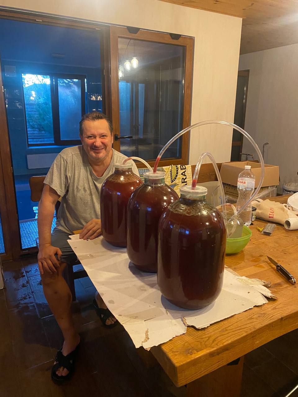 И пусть все вокруг – стол, пол, оборудование, мы сами с ног до головы – было выкрашено сбродившим виноградным соком, зато в бутыльках теперь весело играют тридцать три квадратных литра будущего вина. На фото их тридцать, потому что трехлитровой баночки не видно. В фильме «Иван Васильевич меняет профессию» очень похожее устройство – с такими же трубками и пузырящимися колбами - переносило героев в эпоху Ивана Грозного. Иван Викторович (я) не собирается менять профессию – за педагогику втащу любому, не моргнув. И в другую эпоху Иван Викторович не собирается, как и в другую страну, в другую веру, в другой образ жизни и вообще во что бы то ни было другое.