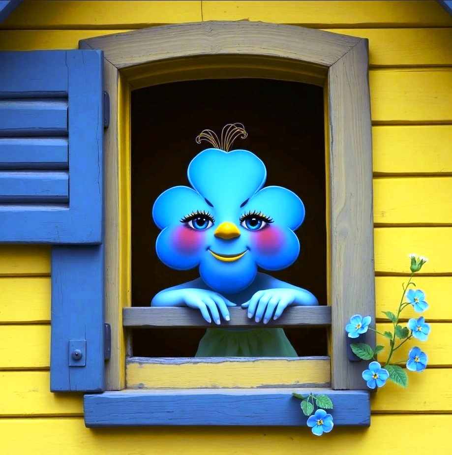 Вдруг из окошка появилась голубая ручка, а затем показалось зевающее личико девочки. Круглое личико, также как и ручки, было голубым. Вместо ушей у девочки были два маленьких голубых лепесточка, а длинные густые ресницы, маленький носик и пухлые губки были ярко-жёлтого цвета. Глаза были круглыми, а зрачки янтарно-коричневыми, как полоски на спине у пчёлки.