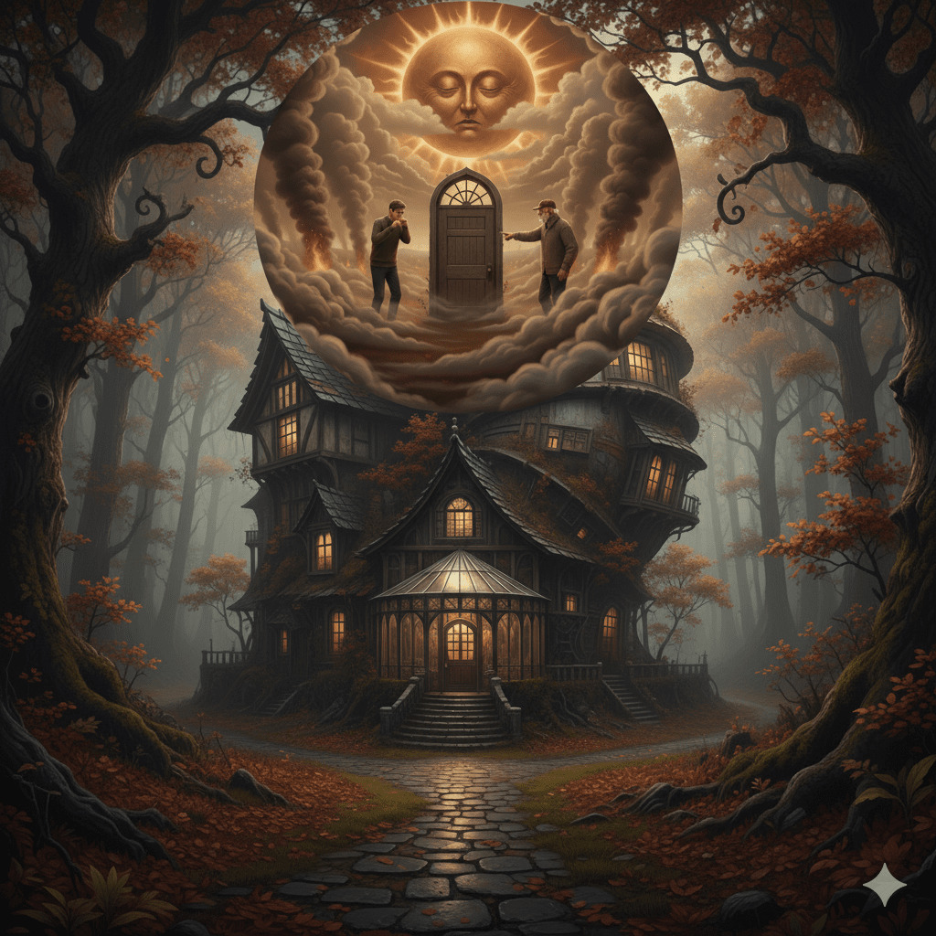 Мы с женой заехали в гости к моим родителям и так вышло, что остались у них на ночь. Дом в котором они жили, и смею надеяться живут до сих пор, заслуживает отдельной истории. Дело в том, что это было не просто жилое строение, но целый живой организм.... лабиринт, сотканный из чужих историй и фрагментов памяти. Он не был построен, а будто бы сам рос, как причудливая спираль, и каждый новый владелец добавлял к этой фрактильной геометрии безумного математика (на вроде Кэрролла) свои стены, пристройки и коридоры. Этот дом был не просто похож на покинутую раковину запасливого молюска,это была спираль, извилистый лабиринт, где каждый поворот коридора буквально открывал дверь в новый мир.