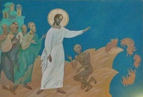 И вкратце ещё раз повторю: Христос, ведя Свою миссию, должен был ходить напрямик и, соответственно, этими местами, где жили эти гадаринские бесноватые. Никто даже близко не смел проходить мимо; такую они имели ненависть, с такой жестокостью они нападали на всех, так что местные жители пытались их связать, заковывали их и в цепи, но они разбивали эти все узы и неистовствовали страшно. И мы видим, как Христос, совершая Свою миссию, совершенно безбоязненно идёт этими местами и совершенно спокойно исцеляет их. И мы с вами помним диалог бесов, когда Господь обращается к одному из них, вопрошая его имя, мы помним, как один из них нагло отвечает: имя мне легион, ибо много нас. А Христу это все равно, сколько бы их там ни было, вот мы помним, что было стадо свиное, около 2000, у нас, наверное, на свиноферме, может быть, столько и нету, да, то есть вот представьте, сколько людей там жило, чтобы можно было пасти этих свиней, да? Это ж там целый город, наверное, какой-то был, чтобы обеспечивать пропитанием этот город вот они занимались такой деятельностью, которая была запрещена в Библии. Да, мы с вами знаем о том, что для евреев, для иудеев, свинья - это нечистое животное, до сегодняшнего дня. Но Христос, получается, разоряет их, оставляет без пищи и исцеляет этих 2 гадаринских бесноватых; здесь что важно?