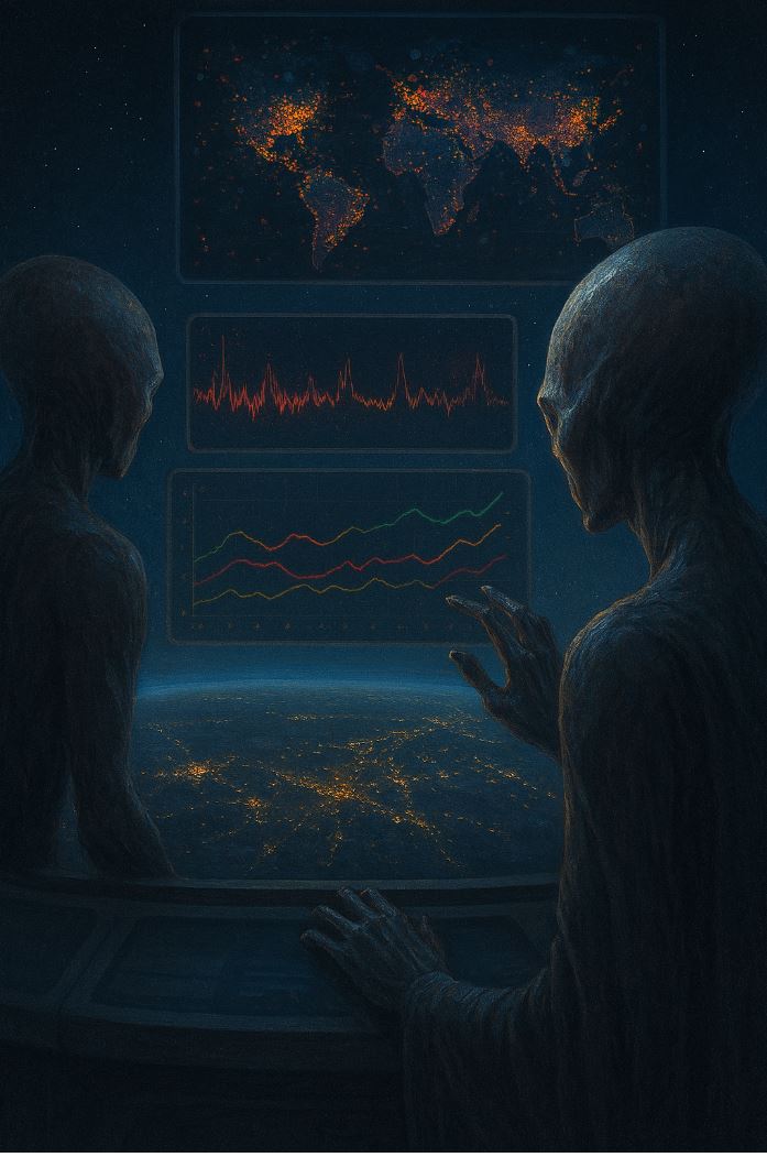– Да. На верхнем уровне – световые карты городов за тысячелетие: вспышки, провалы, миграционные реки. Ни одного лица, только пульс массы. На среднем – спектры радиошума: сначала молитвы, потом лозунги, потом формулы, затем шёпот рынков. На базовом – кривые: рождаемость, доверие, складывающиеся союзы, распадающиеся рынки. Я смотрю – и не могу выключить.