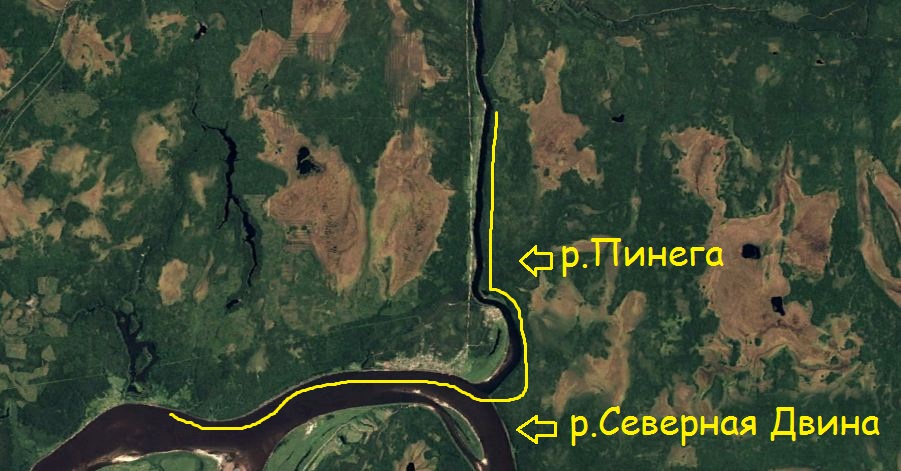 Река Пинега протекает в Архангельской области и впадает в Северную Двину. Название Пи-нега дано по форме устья на карте, буквально "тонкая нога", как видно на фото.
