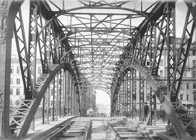 В 1908 году мост был перестроен для прокладки трамвайной линии по проекту талантливого инженера Григория Кривошеина. И уже после установки фермы для архитектурного оформления моста был приглашён академик архитектуры Мариан Перетяткович. Порталы моста были украшены пальметками и греческим орнаментом. Перильное ограждение — металлическое, однотипное с решёткой набережной Фонтанки.