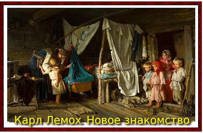 Карл Викентьевич умело изображал детей, их непосредственность и простодушие. А знаете, как он работал над своими картинами? Он снимал в Ховрине на лето деревенский дом и устраивал в нём мастерскую, куда приглашал местных крестьян — детей и взрослых. Писал с натуры разные сюжеты из крестьянской жизни — как, например, на этой картине, рождение нового члена семьи — а потом щедро платил натурщикам за работу. И обратите внимание, как правдиво, не приукрашивая, художник изобразил настоящую крестьянскую жизнь. Посмотрите, деревянный пол в избе неровный, доски торчат, где-то валяется корзина и разбросаны тряпки... Дети босые и одеты бедно. Но при этом почему-то нет ощущения беспорядка в доме. Всё скромно, но чисто. Здесь будто царит особая гармония, где главное — это настоящая жизнь и любовь между членами семьи. Кстати, художник не только правдиво изображал крестьянскую жизнь, но и искренне, от всего сердца помогал жителям деревни. Кому-то оплатил ремонт или постройку дома, кому-то помог корову приобрести. Помогал продуктами и деньгами... Однажды он пожертвовал большую сумму на открытие церковно-приходской школы при местном храме иконы Божией Матери «Знамение».