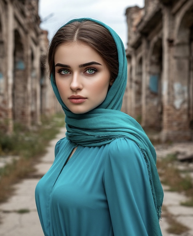 Красавица с сине-зелеными глазами выглядела потрясающе: идеально сшитое голубое платье, матовый цвет кожи, дугообразные брови, тонкие черты лица и бирюзовый шарф на длинной шее — довершал образ чеченской девушки.