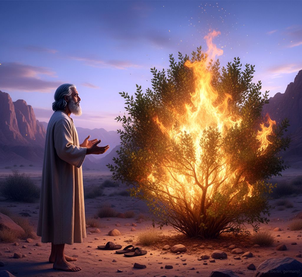 «И дал посланец (ангел) Господа узреть себя Моисею в огненном пламени из терновника. И видел Моисей: терновник горит огнём, но не сгорает. И решил Моисей: пойду и посмотрю на это удивительное знамение, почему не сгорает терновник. И увидел Господь, что он пришёл посмотреть, и воззвал к нему Бог из терновника, и сказал: Моше, Моше. И ответил тот: я здесь. И сказал Бог: не приближайся сюда, сними обувь со своих ног, ибо место, на котором ты стоишь — земля святая» (Исход 3:2-5).