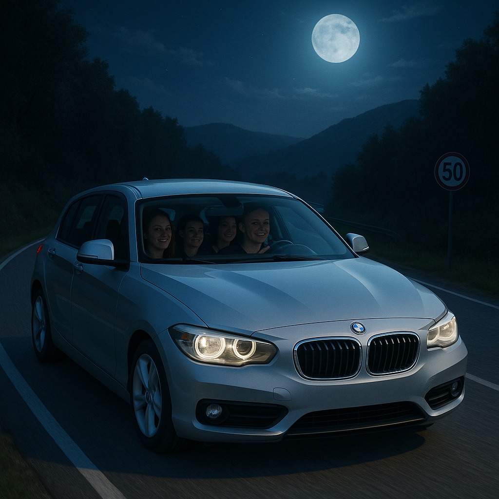 Дорога — серпантин в гору. Отличный асфальт, разметка, только ограничение 50 км/час. Впереди мотоциклист, спокойно едет по правилам. Но БМВ идёт на обгон. Ночь, адреналин, желание быть крутым. И полное отсутствие опыта. Руль — чуть в сторону, и всё кончено. Машину выбросило с дороги. Удар о дерево. Миг — и жизнь четверых молодых людей оборвалась.